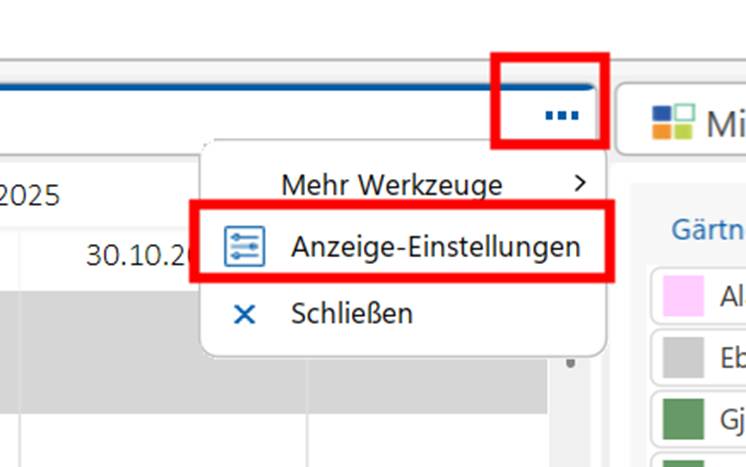 Jedes Fenster mit einer Kalenderanzeige hat oben rechts ein Icon mit drei Punkten. Darüber werden die Anzeigeeinstellungen aufgerufen.