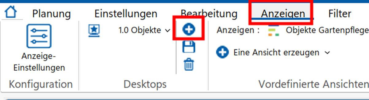 Es ist auch möglich, diese geänderte Konfiguration als eigenen privaten Desktop zu speichern. Dann über Anzeigen und das Plus-Symbol einen neuen Desktop anlegen