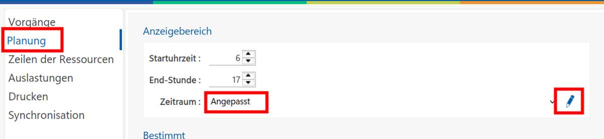Links im Menü „Planung“ auswählen und dort bei Anzeigebereich / Zeitraum auf das Stiftsymbol bei „Angepasst“ klicken.