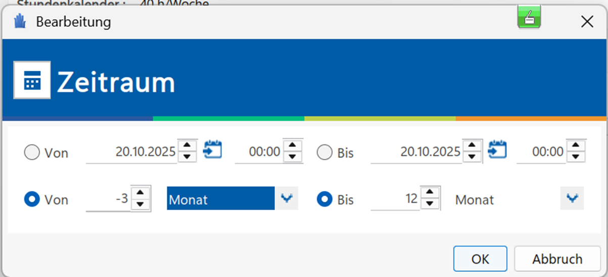 Es öffnet sich ein Fenster, in dem ein Zeitraum konfiguriert werden kann. Dabei sollte nicht mit festen Datumsangaben gearbeitet werden, sondern immer mit einem „rollierenden“ Zeitraum.