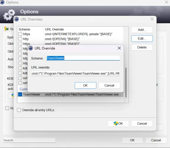 5. unter URL Override wird der Pfad wie folgt eingetragen, unter welcher TeamViewer.exe liegt