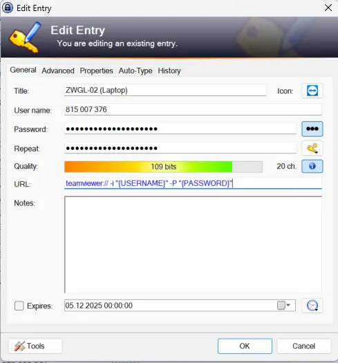 8. In das Feld URL folgendes eintragen: teamviewer:// -i "{USERNAME}" -P "{PASSWORD}” → mit “OK” bestätigen
