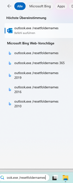 Outlook startet neu und führt einen Reset der Ordnernamen durch.
